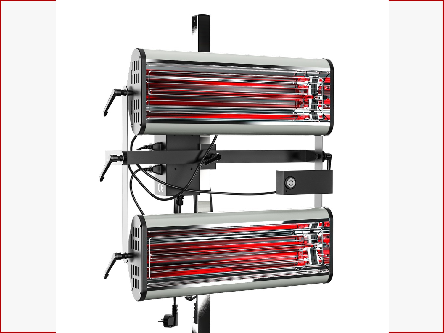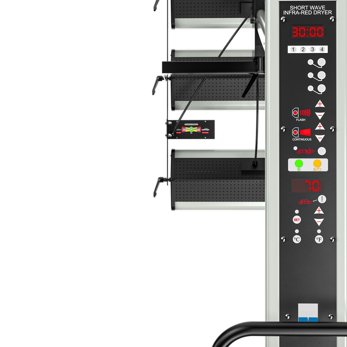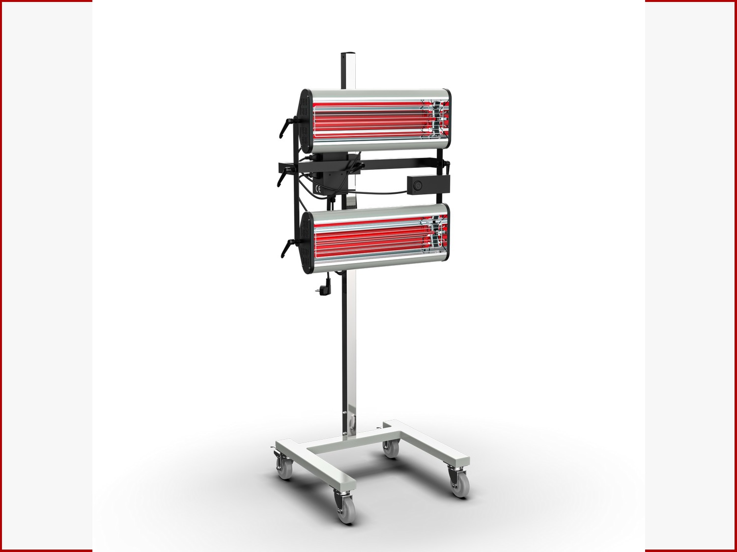 The short-wave infrared heater IR-B02 is the perfect IR drying heater when it comes to the best possible performance in a small space. With compact dimensions, 4 castors and 10 meters of cable, it can be used flexibly even when space is limited. With two individually switchable cassettes, the heater offers a drying area of up to 600×800 mm. For the best possible energy and thus cost savings, only one cassette can be activated for smaller drying areas.