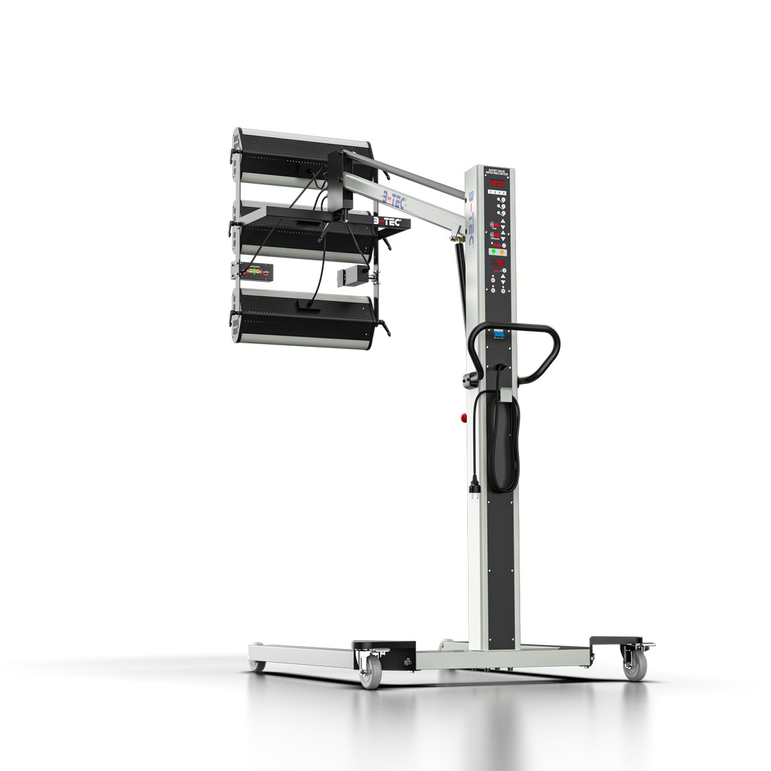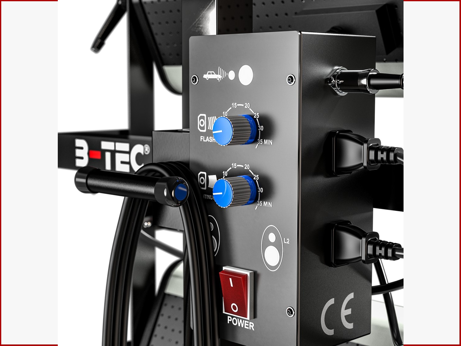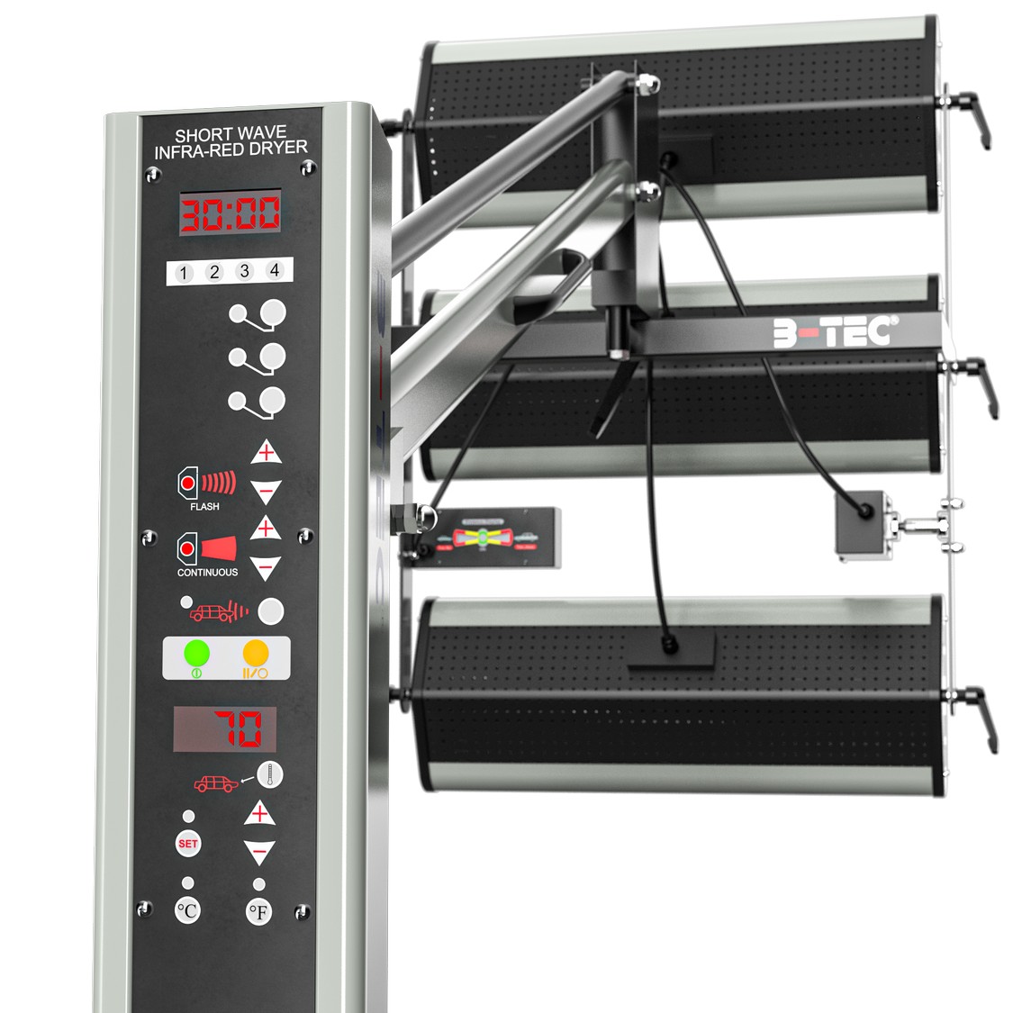 Like all B-TEC IR drying radiators (excluding IR-X), the IR-B03 also has a 2-stage drying system (flashlight / continuous drying) to gently heat the paintwork from the inside out and thus avoid paintwork problems such as “popping” and to prevent “acceptance”.
