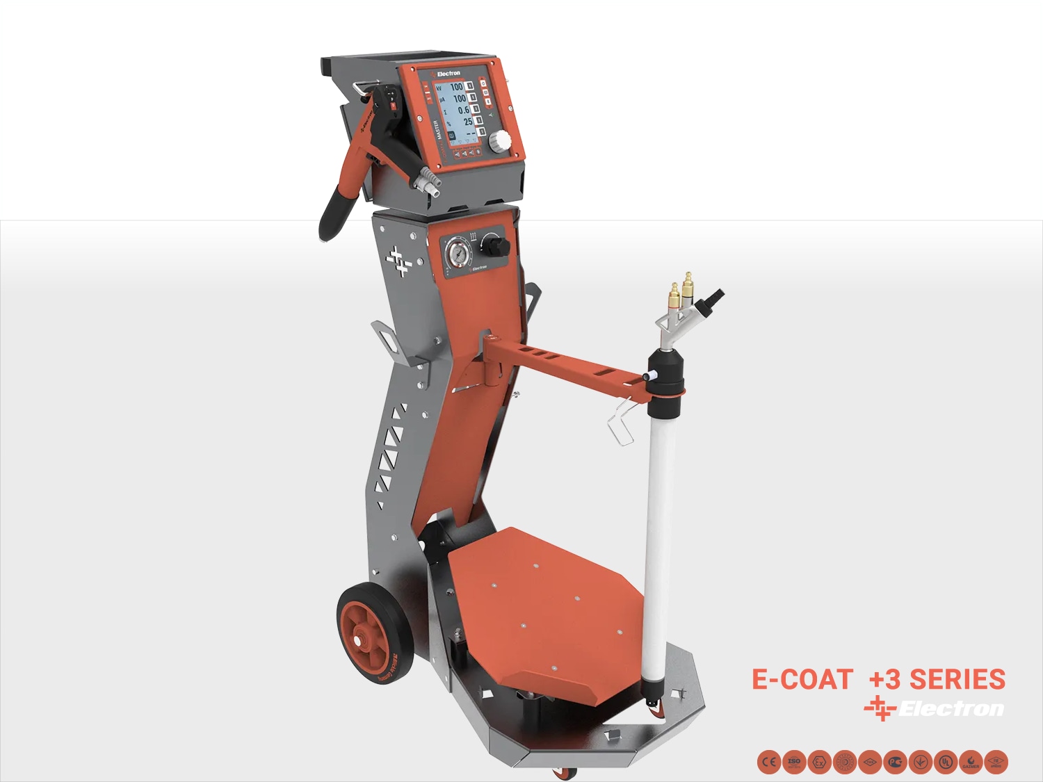 The Master M Multicolor powder coating equipment powder gun from Electron is ideal for frequent as well as thorough color changes. In addition, the unit offers the highest degree of flexibility. Process the entire original container with ease using the optional fluidized suction lance and slanted vibrating base.