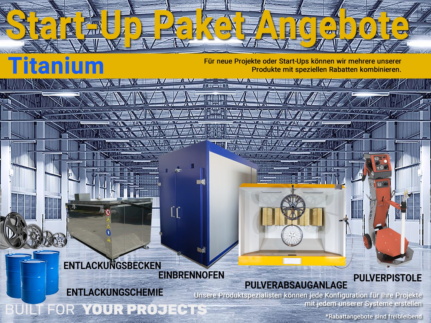 Pulverbeschichtung + Entlackung StartUp Paket. Einbrennofen + Pulverabsauganlage + Pulverpistole + Entlackungsbecken + Entlackungschemie